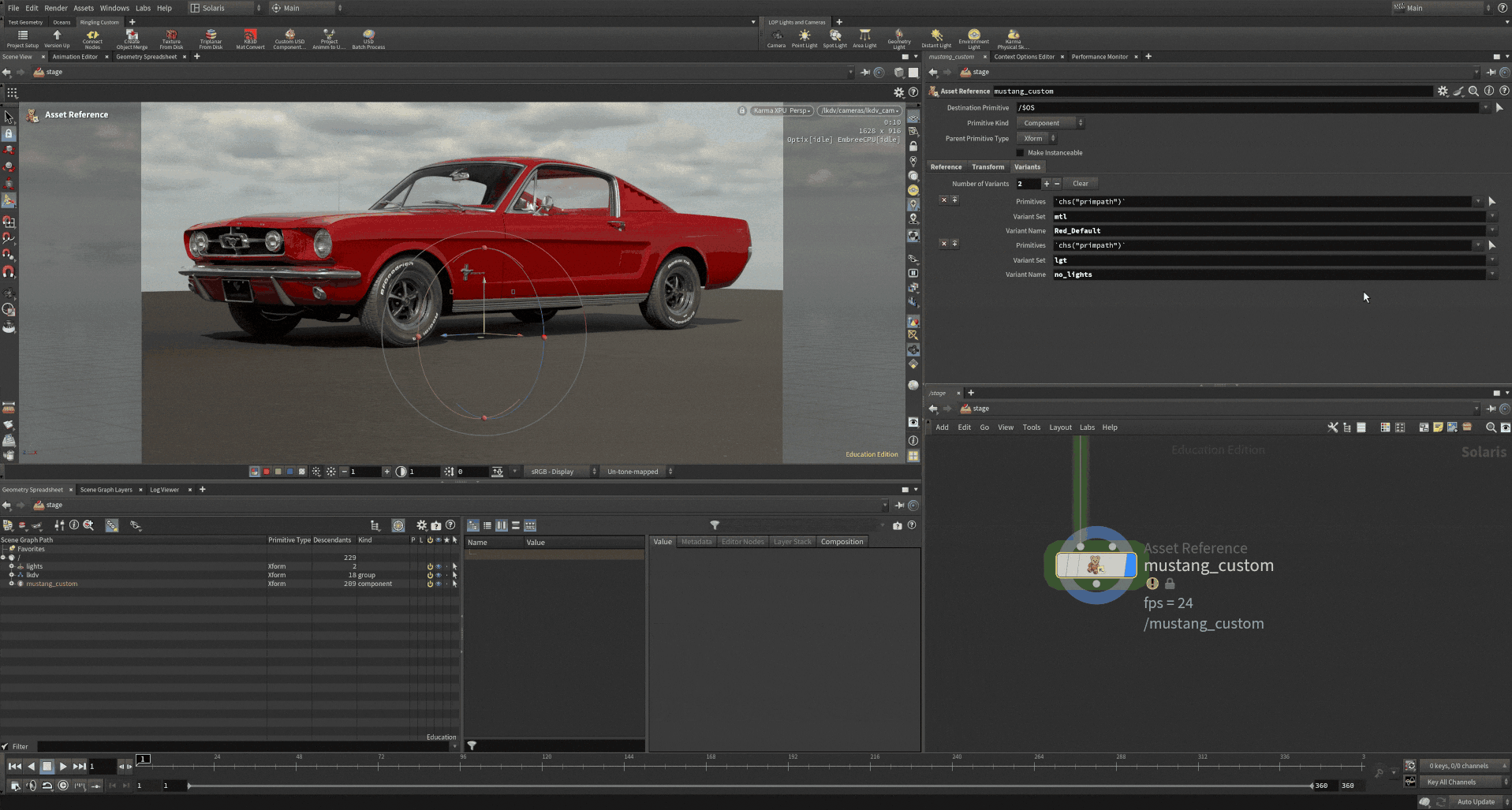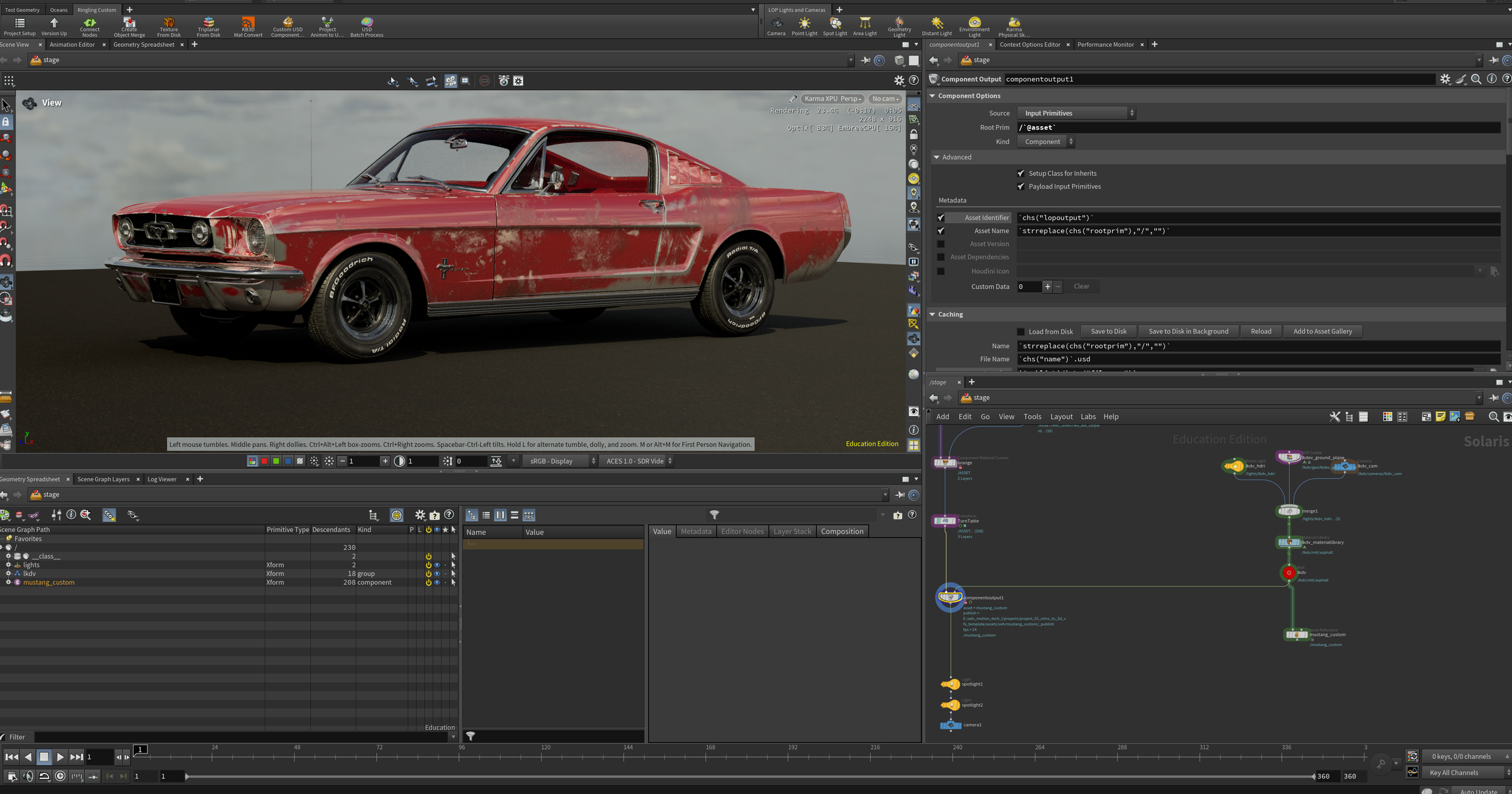 Below are two turn tables showing how the car model looks after applying the shaders in Houdini with some proper lighting. The left turntable shows the details of the car, while the right turntables shows the different lighting scenarios and how the car reflects them.