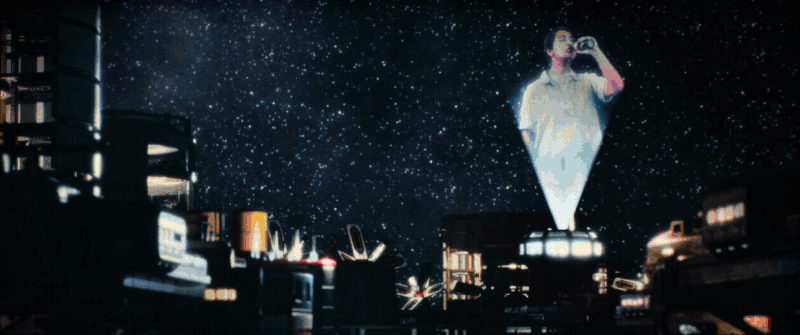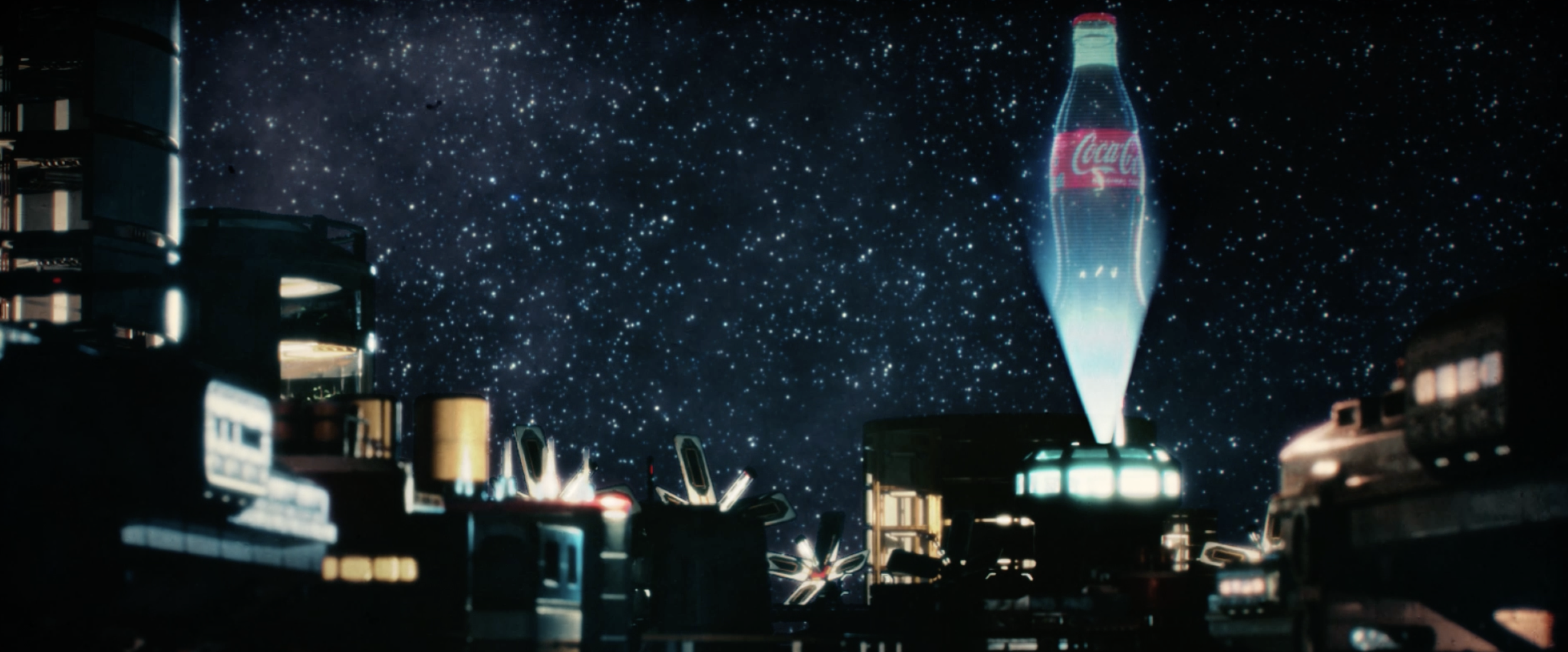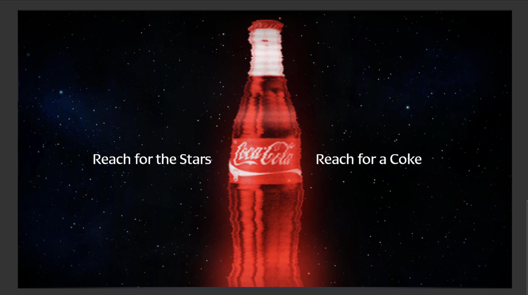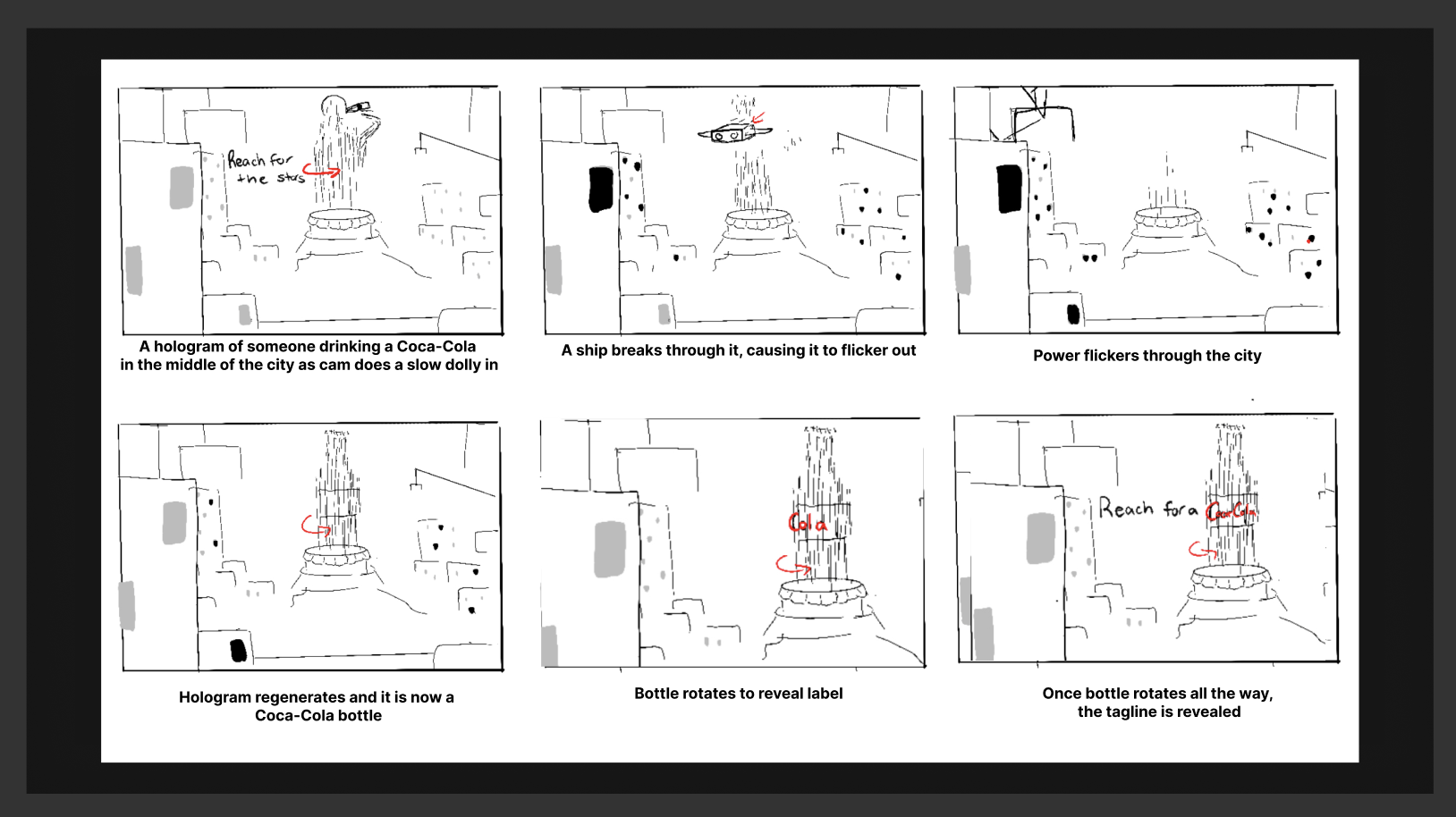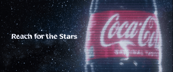 The concept of the animation is a hologram of someone drinking Coca-Cola, projected in the middle of a futuristic city. The hologram then glitches and shifts to reveal a full Coca-Cola bottle, slowly bringing the label and logo into focus. The scene then cuts to the lockup “Reach for the Stars, Reach for a Coke,” animating on screen alongside a close-up of the hologram’s Coca-Cola label. Setting the piece in a space-themed environment reinforces the slogan, while beginning with someone enjoying the drink before transitioning to the final product highlights how the brand values consumer enjoyment as a central part of its identity.