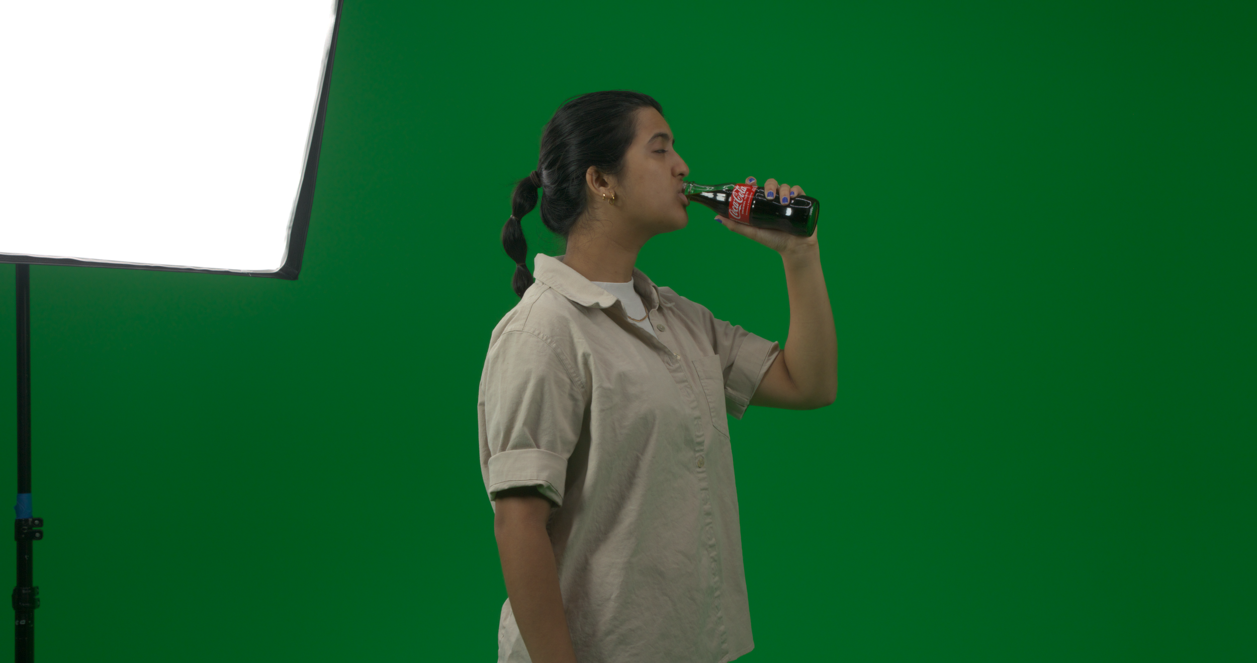 The first step in creating my hologram was filming my model in the green screen room so I could key her out cleanly. I placed her on a turntable and rotated her at a consistent, even pace. Including a person physically drinking a Coca-Cola, along with the model, reinforces the brand’s core value of customer satisfaction.