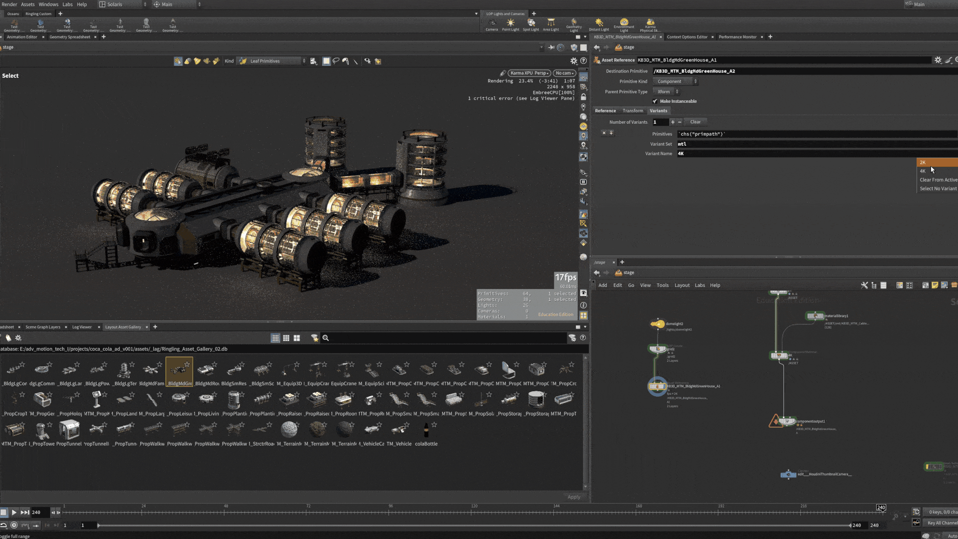 Like the bottle, I created light variations of the assets so that I could chose what time of day my scene was set in without replacing my asset entirely. Through the component geometry node, I saved the asset to disk and created a new asset with the light variations. Once the asset was in the library, I dragged it into the scene above and went to the variant tab and added 1 variant. Under variant set, I selected light (lgt) to turn them on.