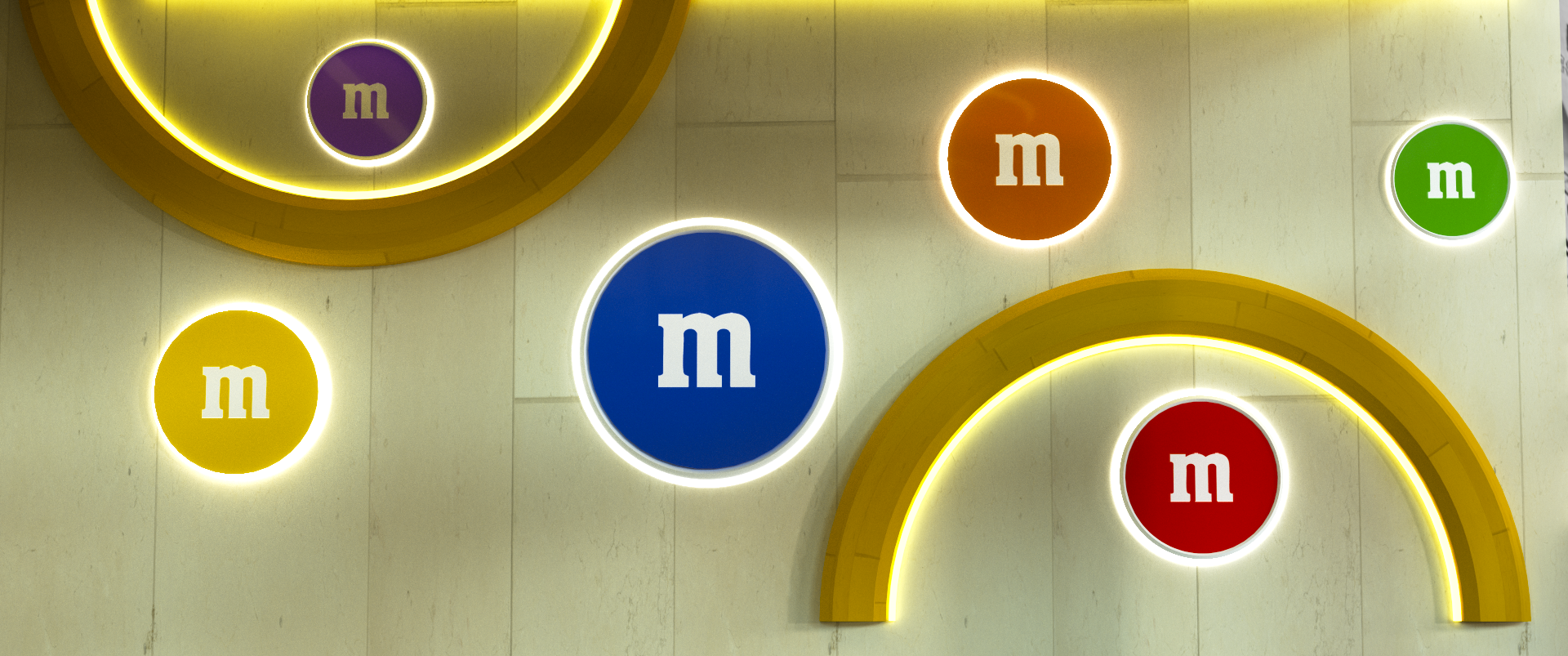 The scene was designed to hint at machinery without looking too technical. We took cues from M&M Stores, using their white tiles, yellow accents, and signature wall-mounted M&M décor. The side tubes reference the real color-sorting machine. Since the background needed more detail in this first draft, we added an extra tube and circular lights.