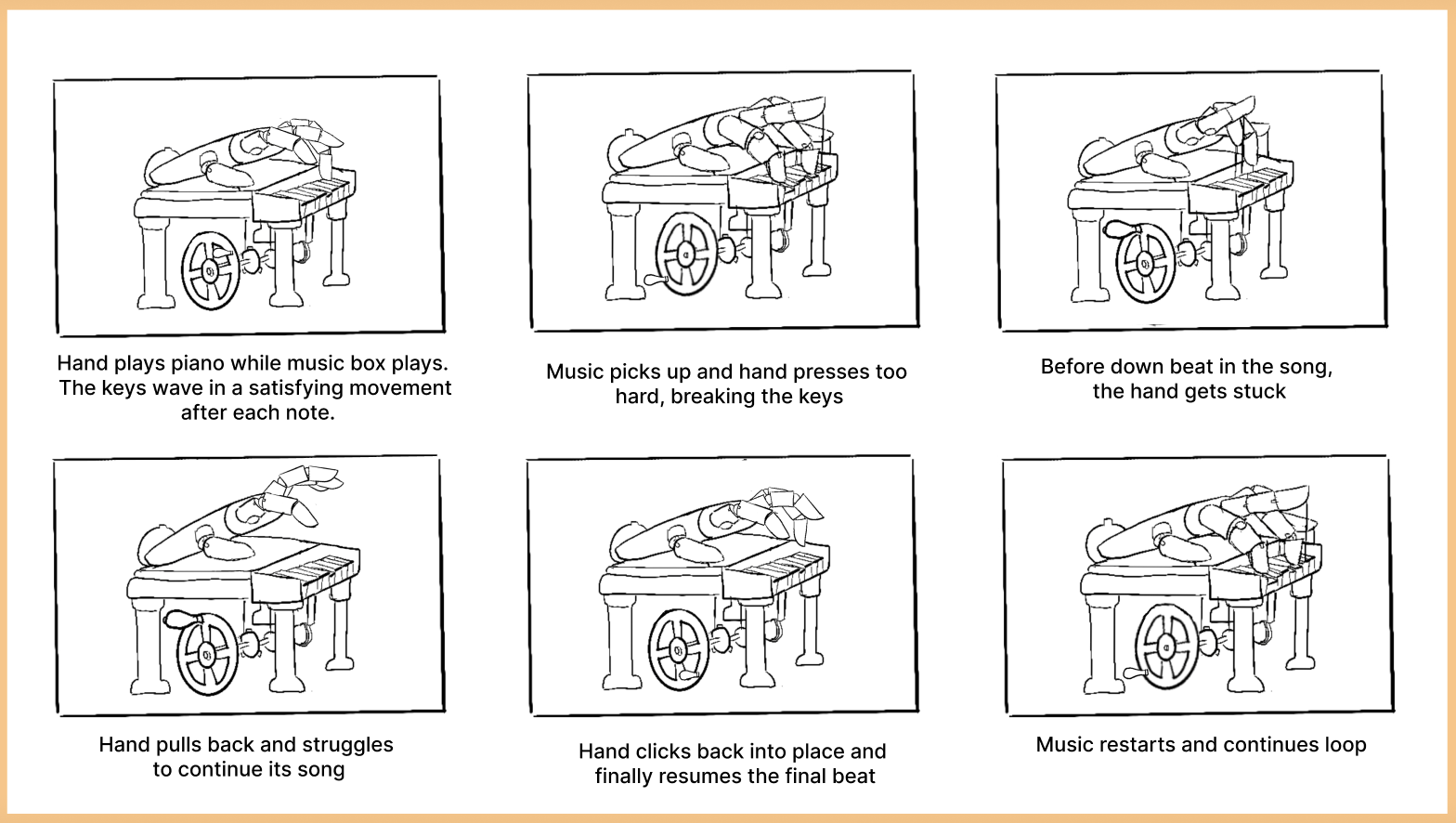 Viewers are already familiar with the motion of a hand, the mechanics of a piano, and the way machines function through physical logic. What catches them off guard is the abrupt halt in the music box's tune before the song reaches its end.